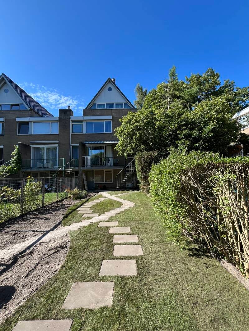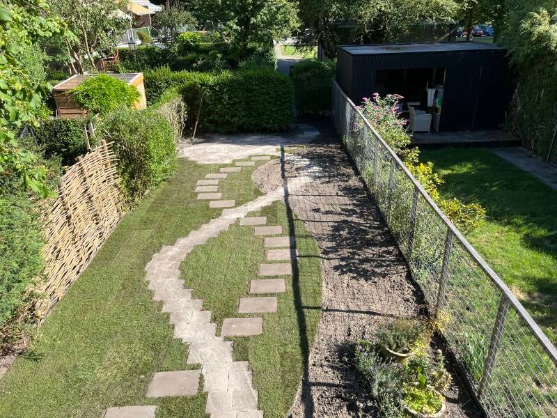Als Laatste stap is de grasmat gelegd, met de volgende speelse tuin als resultaat.